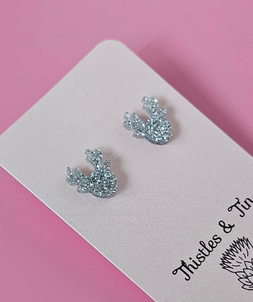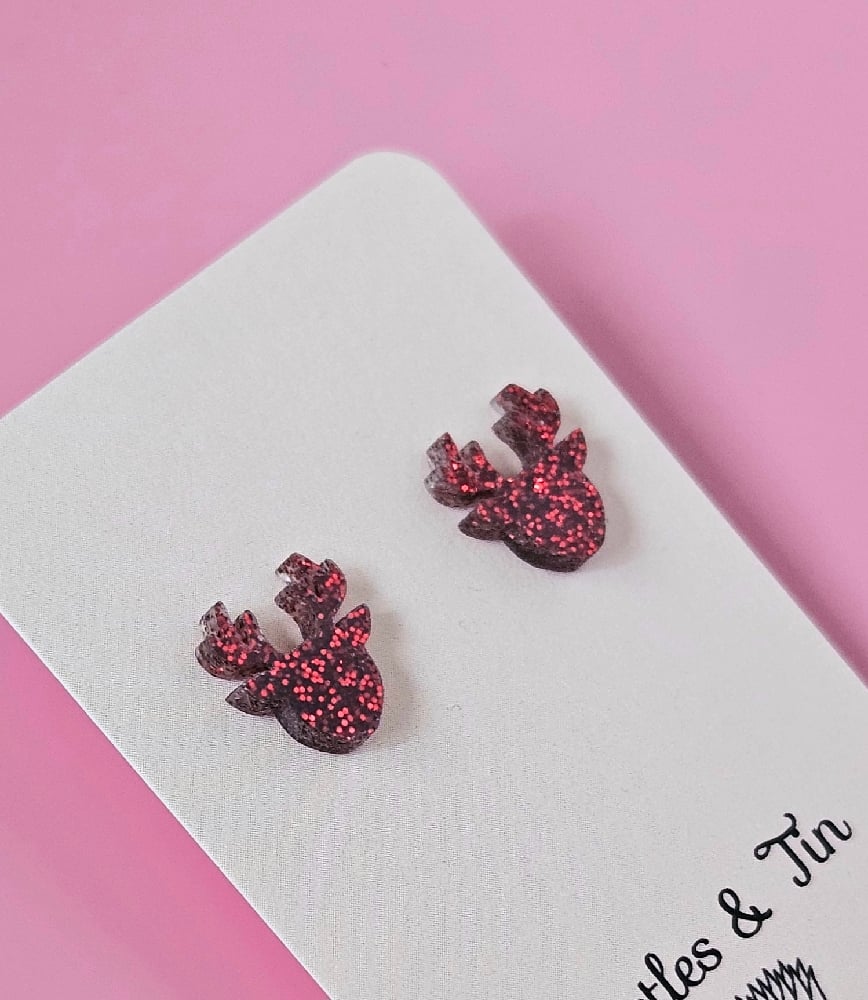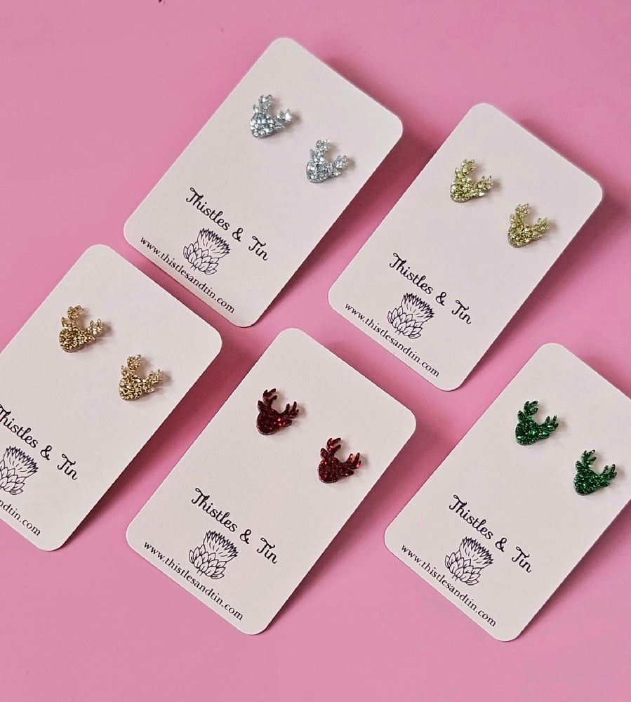 Our Glitter Reindeer Studs are fun fun fun!Lush glitter gives them the sparkle and shine to complete your outfit.