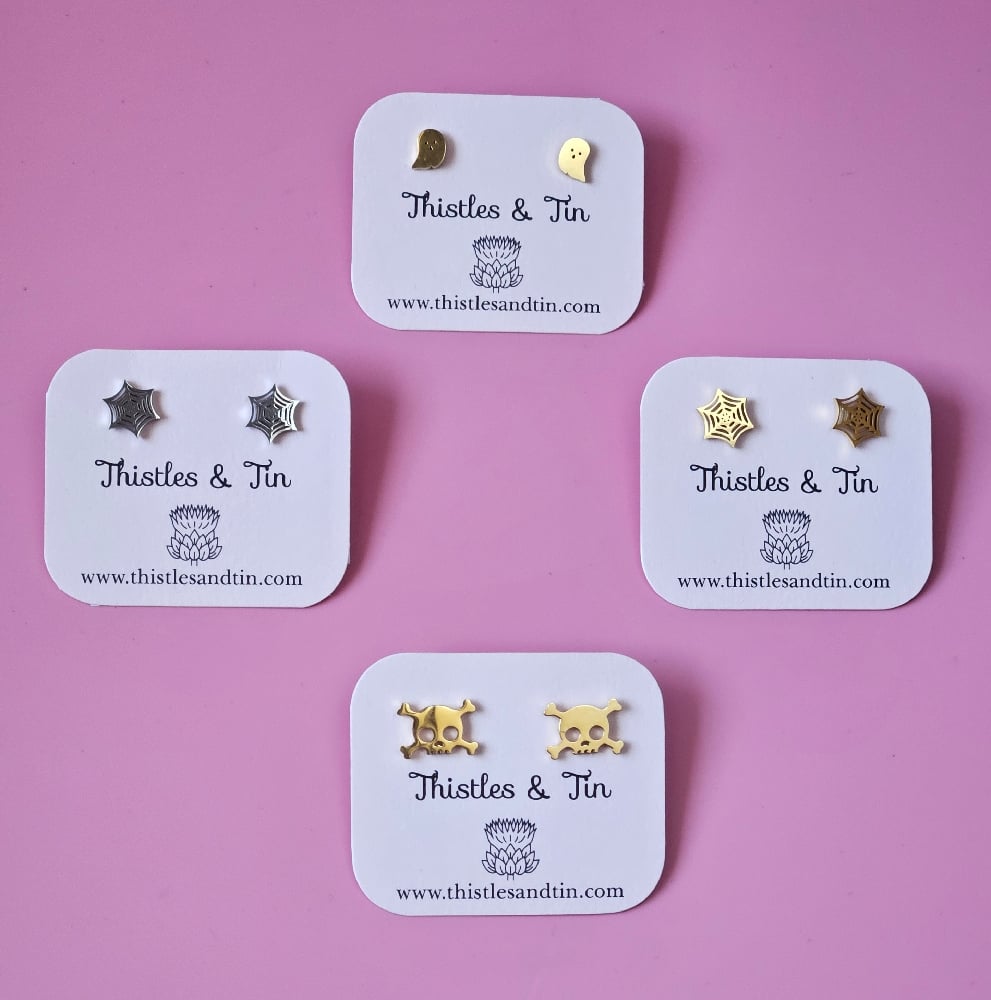 Our Spooky Mini Stud range are the perfect accessory.Tiny but mighty, they come in a range of designs to suit everyone.Available in Silver and Gold.Posts are surgical steel.So light weight, you won't even know you are wearing them!Handmade in Australia with sustainably sourced materials.Measuring 1cm or under.Statement earrings to treasure for a lifetime!CARE INSTRUCTIONS FOR YOUR EARRINGSMetal can be fragile and should be handled with the upmost care to avoid any possible damage.To prolong the life of your jewellery please store them in a safe and dry place. (Not the bottom of your handbag!)Avoid contact with cosmetics, perfumes, moisturisers and oils, these may effect the glue and lustre of the metal.Please do not wear in water. To clean wipe with a soft dry cloth.We have two great store locations.Glen Innes and Tamworth.You are currently shopping the Glen Innes Store.Shop our Tamworth store here:www.thistlesandtintamworth.com
