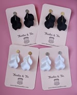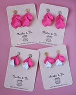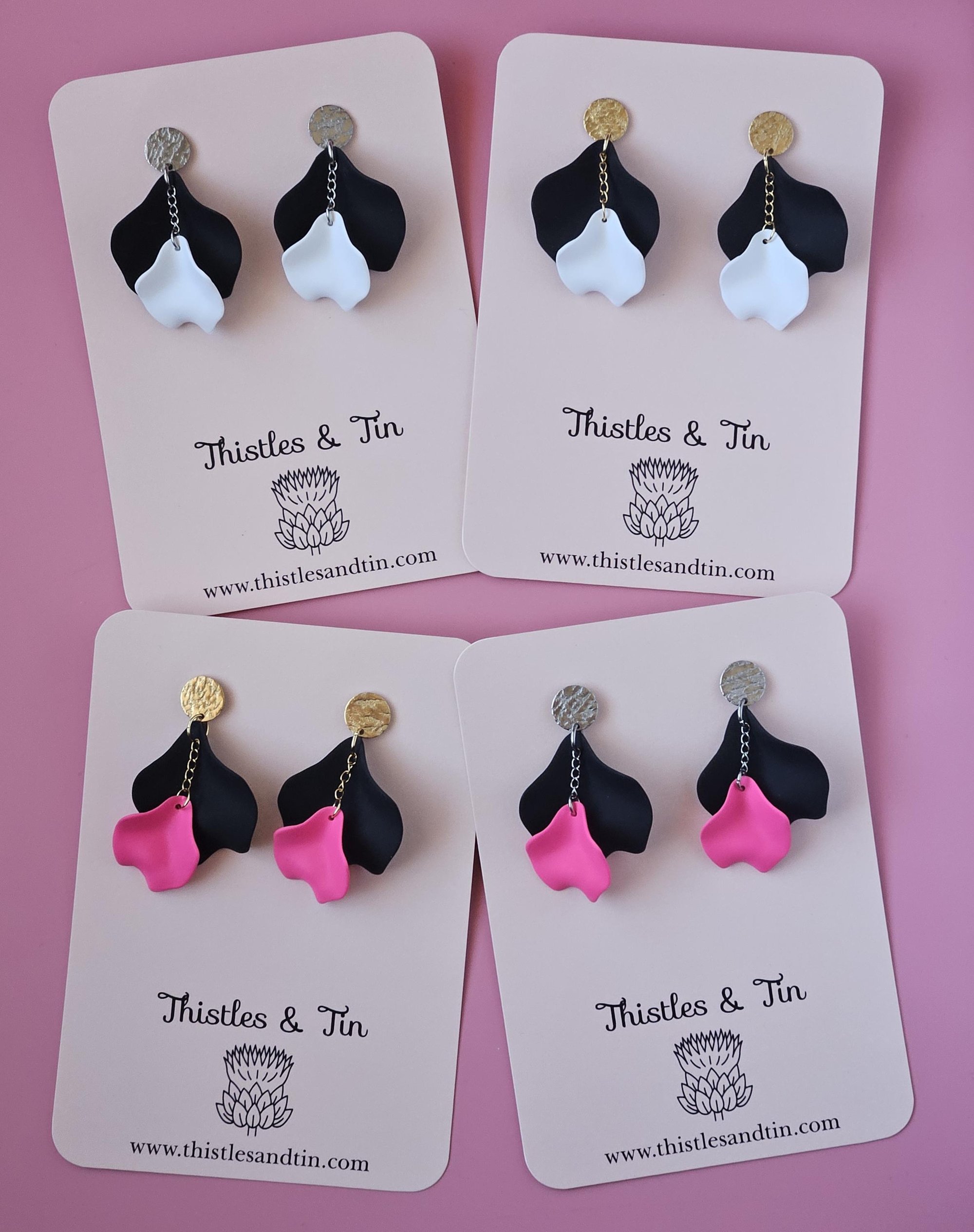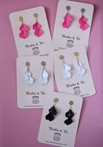 Introducing our exquisite Velvet Petal Dangles, adorned with lush velvety acrylic petals delicately suspended on chains, complemented by a decorative metal top for a touch of elegance.